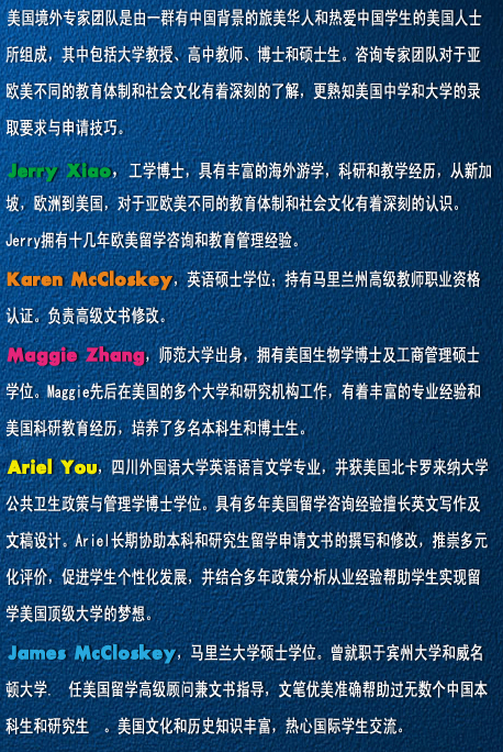 留学美国网资深留学专家,毕业于北京外国语大学,从事留学行业20年工作经验,曾多次参观访问美国(200多所院校考察)、澳大利亚、英国、爱尔兰等英语国家,非常熟悉美国高中留学、美国本科留学和美国硕士留学和签证申请,擅长各种难度大的留学申请和签证,已成功帮助数千人实现留学梦想。