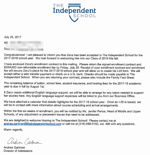 恭喜WZR同学成功拿到堪萨斯州排名第一的高中--独立学院的录取offer!目前2018春季和秋季名额已出,马上咨询:010-65183908;微信:liumeinet2014