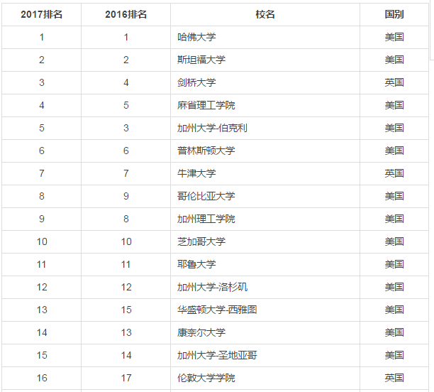 2017世界大学学术排名结果显示:在全球前20强中,美英高校共占据19个席位,保持领先地位。哈佛大学连续第15年蝉联全球第一,斯坦福大学位列世界第二。剑桥大学两年内连升两名,位列全球第三。麻省理工学院从第5名上升至第4名。欧洲大陆的大学中排名最高的是瑞士苏黎世联邦理工学院,排在全球第19名。亚太地区的大学中,日本的东京大学和京都大学表现最佳,分别位列24名和35名。