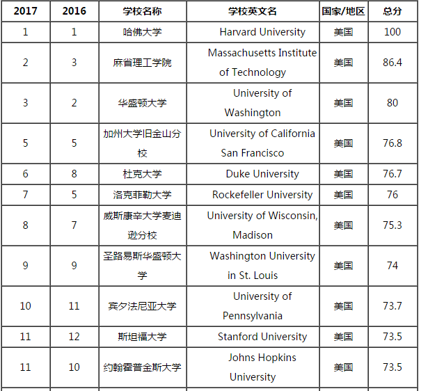 2017年USNEWS微生物学专业排名中,进入TOP10院校的共有9名,其中哈佛大学位于世界第一,麻省理工学院位于世界第二,比去年上升1名。杜克大学由去年的第8名上升到第6名,其他院校波动较小,分别是华盛顿大学、加州大学旧金山分校、洛克菲勒大学、威斯康辛大学麦迪逊分校、圣路易斯华盛顿大学和宾西法尼亚大学。