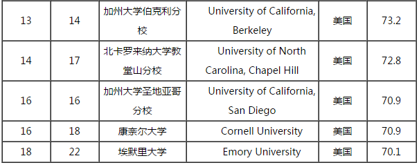 进入排名11-20的院校共有7所,分别是斯坦福大学、约翰霍普金斯大学、加州大学伯克利分校、北卡罗来纳大学教堂山分校、加州大学圣地亚哥分校、康奈尔大学和埃默里大学。其中埃默里大学进步4名,从去年的第22名上升到今年的第18名。
