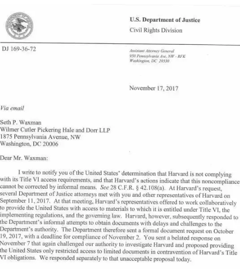 然而,一直到11月17日,在司法部致哈佛大学的信件中,司法部表示,哈佛大学采取了“拖延战术”,到目前为止连一分文件也没提供,态度非常不合作。