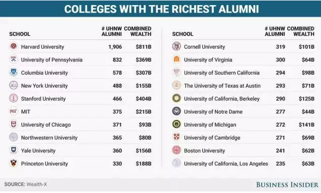 从各大财富排行榜来看,名校学位的含金量也是有目共睹。据去年的“Wealth-X”报道,在评出的亿万富豪最多的20所世界名校中,其中16所是美国高校。而且,世界上大约有四分之一的亿万富豪,虽然出生在国外,但也都毕业于美国名校。