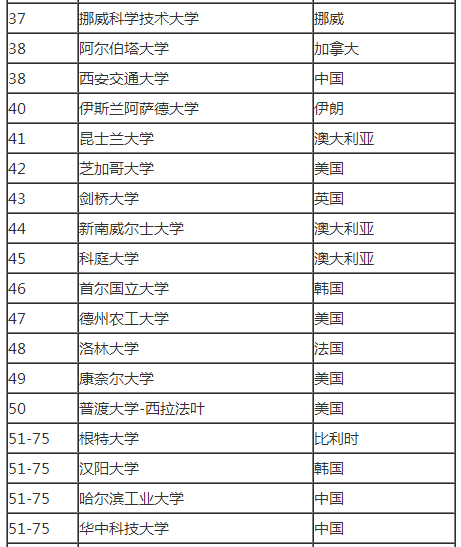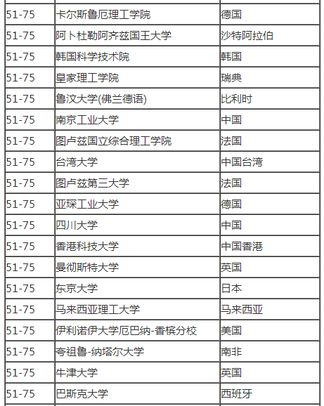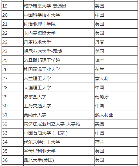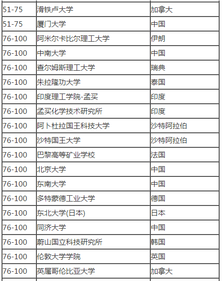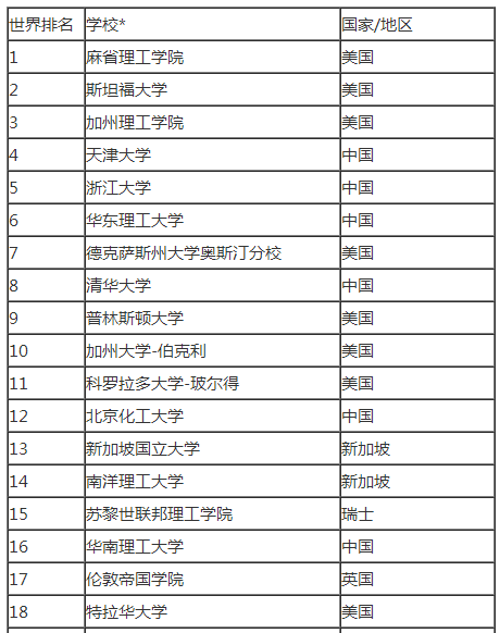 2017美国大学化学工程专业排名前100