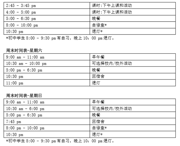 此外,还有周末远足。周末出游的选择包括:新英格兰六旗、AG 彩弹、波士顿购物(科普利 广场/纽伯里街)、伯灵顿购物中心蓝天蹦床公园、新英格兰鲸鱼表演、 “美国之旅”溜冰、 电影院、惠特尼广场购物中心、篮球名人堂、波士顿红袜队棒球赛、深海捕鱼、购物、在蒙 特诺克山徒步旅行、新英格兰足球、昆西市场