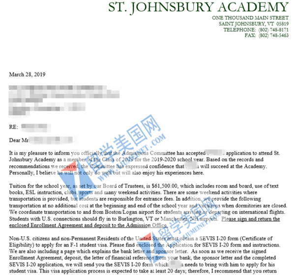 恭喜留学美国网D同学获得St. Johnsbury Academy录取