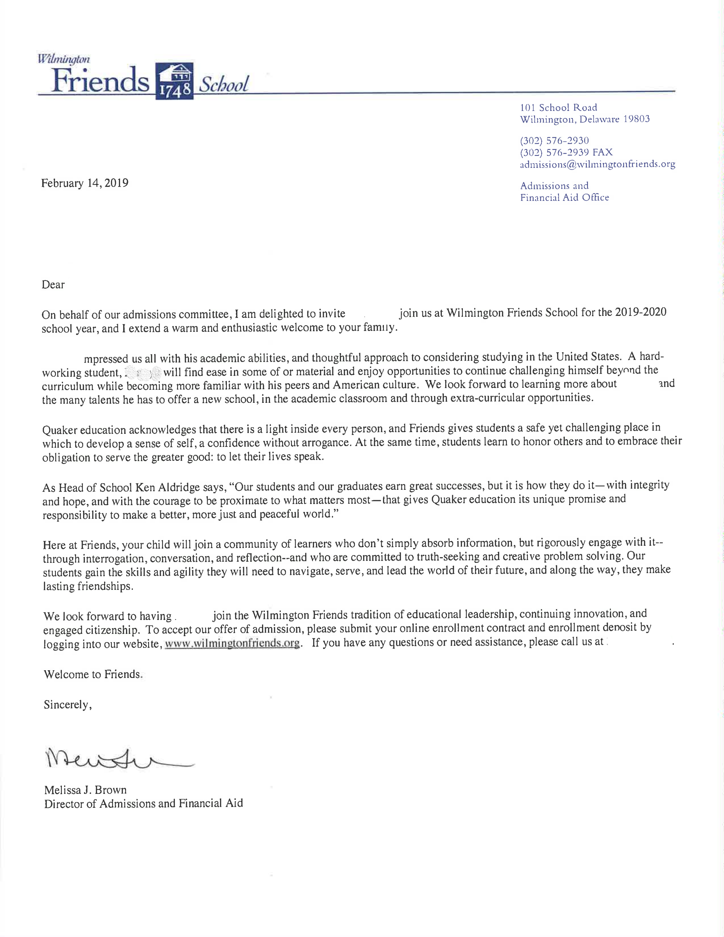 恭喜W同学收获威明顿友好中学Wilmington Friend School