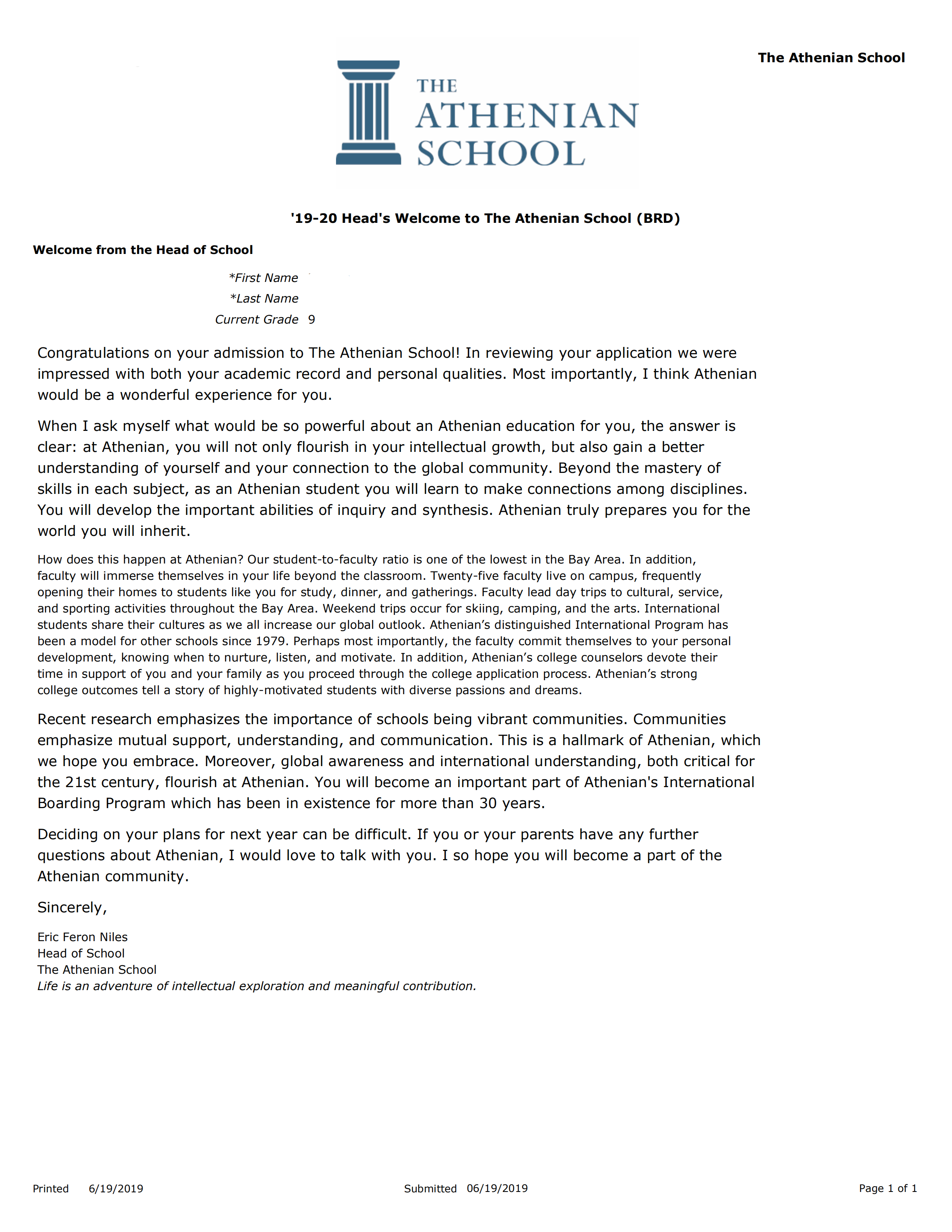 雅典娜中学为男女同校的全日制寄宿中学。小班授课制(平均每班有15名学生左右),着重于每个学生的个性培养。课程设计人性化,从9年级和10年级开始就提供了人文学科课程,并为学生提供多次社会实践的机会,让学生走出校园,更早的适应社会,树立起他们可以在世界舞台上驰骋的信心。年招收的学生中,国际学生占17%,为英语是非母语的学生营造了很好的语言环境。同时为国际学生设立ESL英语语言课程,以更快的提高他们的英语能力,为将来进入大学做好准备。
