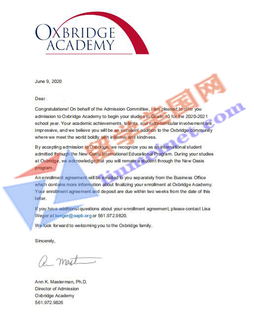大家好!录取捷报!在石老师带领下,经过留美网团队的共同努力,在没有标化成绩的情况下帮助L同学拿到津桥学校(Oxbridge Academy)的录取,恭喜留美网L同学!请见录取offer展示!每一个Offer的背后都凝聚了留美网所有同事的共同努力,再次祝贺T同学!希望他在美国学业有成!同时感谢家长的配合和信任~
