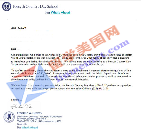 大家好!留美网再传录取捷报!在石老师带领下,经过留美网团队的共同努力,成功帮助Z同学拿到北卡顶尖走读高中福赛斯乡村走读学校(Forsyth Country Day School)的录取,恭喜留美网Z同学!请见录取offer展示!每一个Offer的背后都凝聚了留美网所有同事的共同努力,再次祝贺Z同学!希望他在美国学业有成!同时感谢家长的配合和信任~