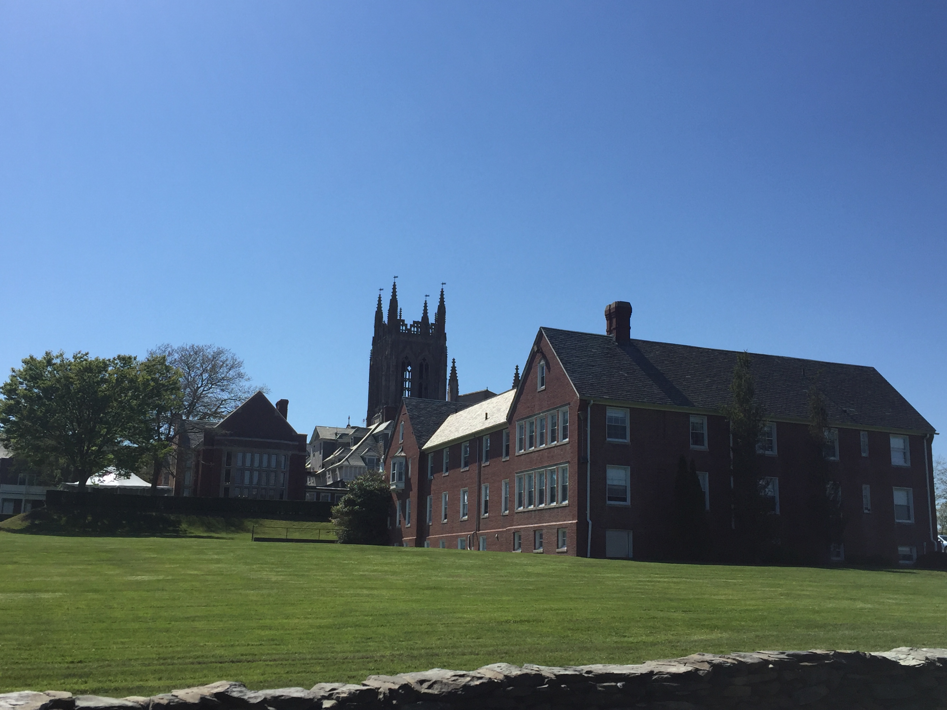 该校是罗德岛一所著名的私立寄宿高中。去过Newport市的人都知道,这里是新英格兰地区最童话般的城市。不管是意大利式的小巷和Downtown熙熙攘攘的人群,还是路边的海盗船和令人瞠目结舌的庄园,都映射出这个城市独特的文化底蕴。学校就坐落在这个城市的一角,旁边就是浩瀚的大西洋。从2号海滩(Second Beach)上看校园,就是一座古堡。如果再加上一点彩虹,就是一幅画了。