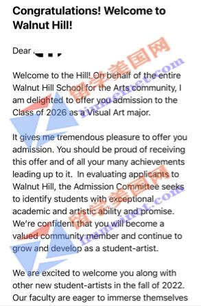 留美网再传录取捷报!恭喜留美网H同学录取到胡桃山艺术高中Walnut Hill School for the Arts~