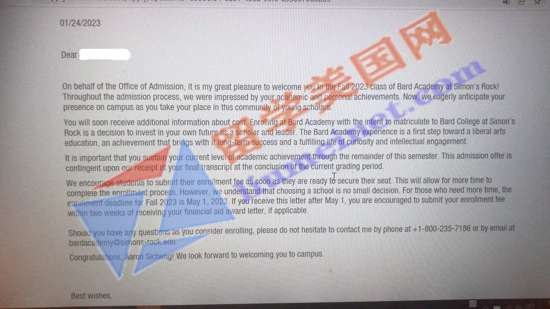 录取喜报~恭喜留美网L同学斩获巴德学院Bard Academy at Simon's Rock录取~