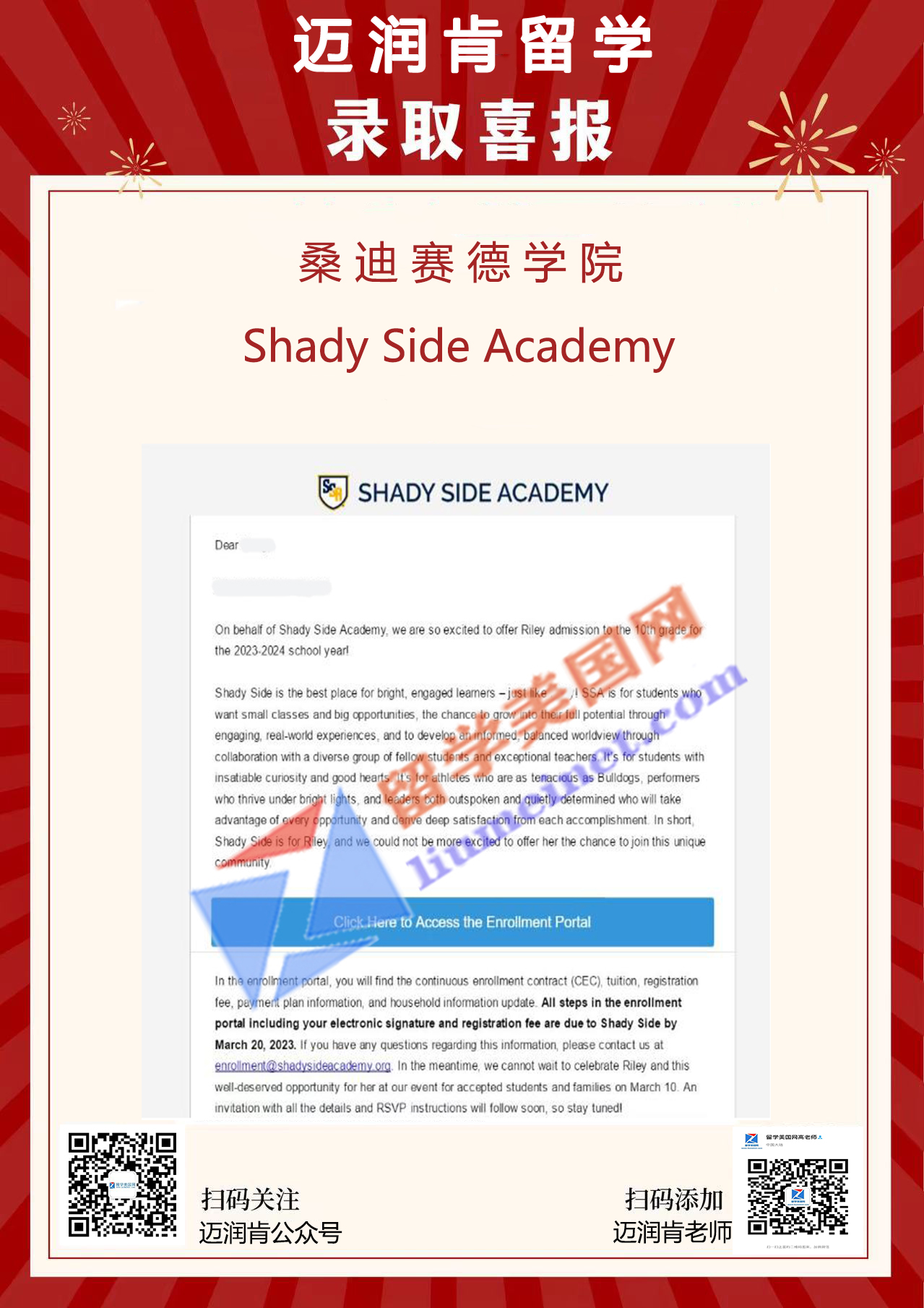 Shady Side有4个校区,高中占地130英亩,位于匹兹堡Fox Chapel郊区。学校通过开展研究,写有说服力论据,批判性思考,磨练学习习惯、管理自己业余时间来学习。留美网今年有学生被录取。