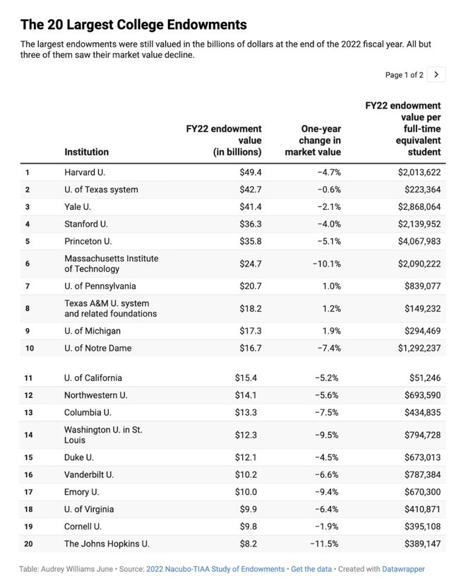 2022年宾夕法尼亚大学捐赠基金规模是207亿美元,位列第七。