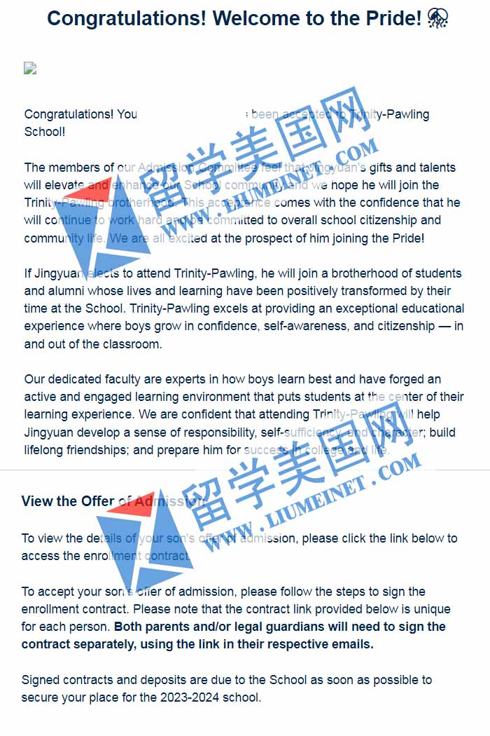 【录取喜报】恭喜留美网学子Y同学斩获圣三一柏林中学录取offer