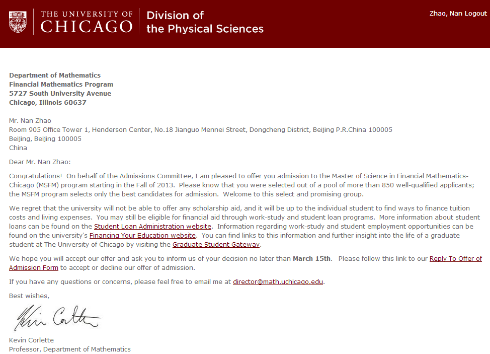 我们不杜撰名校案例,只展示出最真实的录取。下面是赵同学的芝加哥录取信: