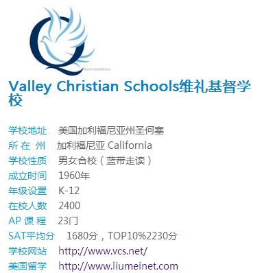 Valley Christian Schools维礼基督学校是一所位于美国圣何塞地区的私立走读高中,招收K-12年级的学生。2013年最新蓝带高中评比中,学校再次获得此殊荣。山谷基督教学校的使命是提供培育环境提供高质量的教育支持奠定了坚实的基础基督教价值观与父母合作,装备学生成为领导人侍奉上帝,为他们的家庭,和积极的影响他们的社区和世界。作为培育基督教学校,风险寻求承认学生的父母谁将支持学校的使命,教育哲学。风险投资,引导学生在权力下放的他们的父母和他们的各种地方教会。父母负责完成教育自己的孩子。