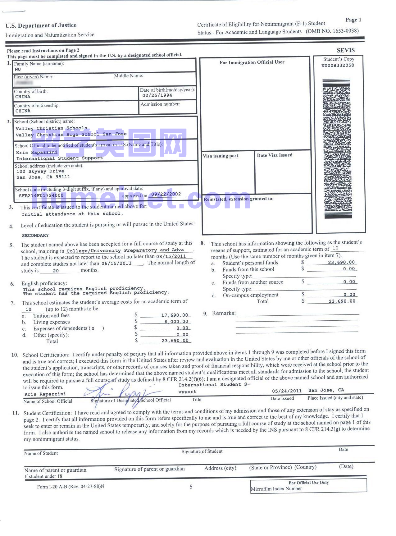 下面是我们一个去该校学生的I-20,目前该生已经毕业并顺利进入加州大学伯克利分校读书。