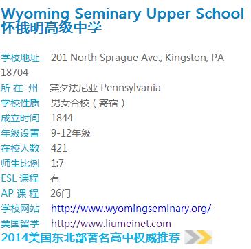 怀俄明高中建于1844年,是美国著名的百年贵族名校,也是美国东北部最古老的中学及大学预科学校。学校注重教学质量,自创建以来一直以“教学严谨、管理严格”著称,55%的毕业生考取并就读于美国著名大学。完成学业的同时,学生可通过学校活泼的教学,了解及欣赏艺术、音乐、科学及文学,让学生学会独立自主、有责任心、学会合作、互相照顾、关心世界及尊重他人。学校位于宾西法尼亚州的东北部,是一个男女合校兼有走读和寄宿的大学预科学校。在这里,学生和老师勇于挑战自我的对方,来实现学术和人生目标。