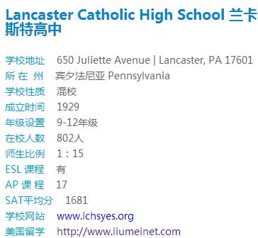 兰卡斯特天主高中Lancaster Catholic High School 成立于1929年,占地 面积约30英亩,是一所提供全日制9至12年级 较大规模的私立高中。教职工88名,其中32名教师拥有硕士 或博士学位。学校以家庭氛围著称,学生和教师关系相当融洽。兰卡斯特高中以科学及艺术方面的成绩突出。学生屡获全美科学和艺术竞赛大奖。2008年,兰卡斯特高中学生获得美国总统奖,美国英特尔科学竞赛奖,全美环保工程奖,全美博物馆和自然历史竞赛奖。每年该 校学生都会获得地区各类学术竞赛60%的奖项。学校课程设置相当丰富,在科学和艺术领 域为优秀学生提供了各种富有挑战性的课程和课外项目。学生在科技和艺术方面的兴趣和特长能得到充分发挥,学校每年都有大量的学生进入众多全美顶尖大学。