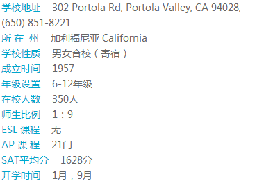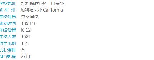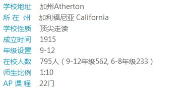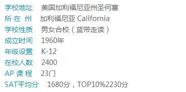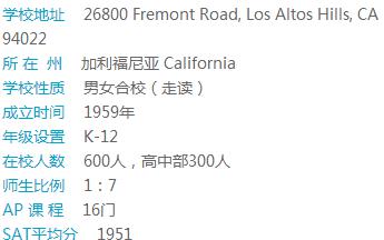 The Harker School学校共有三个校区,每个小区都离得不远,并有交通车课接送往返。学校景色优美,安全、治安佳。该校以严谨校风闻名,大学录取名单两眼。学校小班授课,提供28门AP课程和30多门荣誉课程。许多学生SAT成绩高到可领取大学奖学金,可以自豪的说该校是全面最Top的私立中学之一。学校十分重视科技能力培养。学校拥有最新科技硬件和软件的计算机科学教师、艺术舞蹈练习室、科技中心、体育馆、图书馆等。