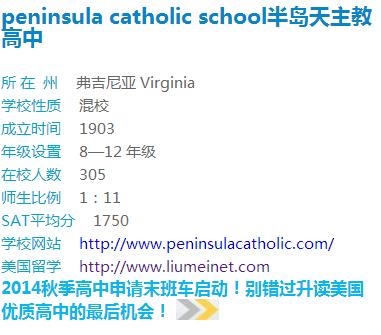 Penninsula Catholic High School半岛中学位于弗吉尼亚州海滨城市纽波特纽斯,距离弗吉尼亚著名的历史名城威廉姆斯堡20分钟车程,滨临大西洋。该市建有世界著名的纽波特纽斯造船厂(包括制造核潜艇),美国现役所有航母均出自该厂。该市在电子仪器、石油炼制、金属加工、建筑材料、化学、食品等工业较发达。