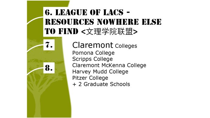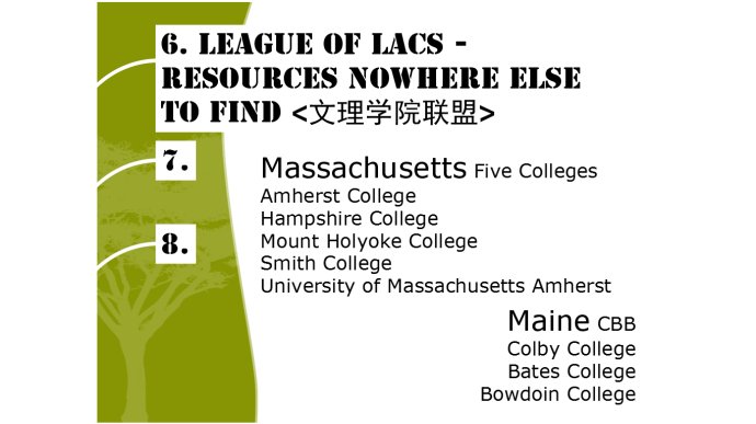 (6) league of LACs - resources nowhere else to find【文理学院联盟 - 无处可寻的资源】正如前文提到的,相互距离近的几所文理学院为了实现资源共享,同时保证各自的高师生比和小班化教学,因此决定彼此之间形成联盟。文理学院联盟非常常见,比如麻省的五校联盟包括Amherst College,Hampshire College,Mount Holyoke College,Smith College,University of Massachusetts Amherst;缅因的CBB三校联盟包括Colby College,Bates College,Bowdoin College;俄亥俄的五校联盟包括Oberlin College,Kenyon College,Ohio Wesleyan University,Denison University,College of Wooster;宾州Quakers三校联盟包括Haverford College,Bryn Mawr College,Swarthmore College;而加州Claremont【克莱蒙特】五校联盟包括Pomona College,Scripps College,Claremont McKenna College,Harvey Mudd College,Pitzer College,另外还有两所研究生院。这些文理学院联盟的丰富资源甚至是很多综合性大学都无法企及的呢~