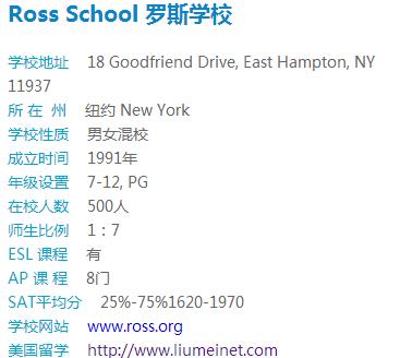 Ross School成立于 1991年,学校有有两个校区,初年级的校区位于纽约长岛的 Bridgehampton ,而高年级的校区则位于 East Hampton,这里风景怡人,交通方便,大约需要开车2小时就可到达纽约市中心。这里不像纽约市那样喧闹繁华,却因为保留着美好的自然景观和人文气息而被人所吸引。 两个校区学生加起来共约 600 人。该校学生宿舍及教室,设备都非常的新且漂亮。Ross School 的校园是位在一片树林之中。校舍共有五栋,分散在树林间,学校没有围墙,所以并不容易看出该校明显的边界。该校标榜的课程核心是全球文化史 (global cultural history) ,所有学科是绕着这个主轴进行的。Ross School 所强调的教育理念是要培养二十一世纪的、具世界观的全人,因此,不仅要对世界的文化有一个宏观的了解,也要懂得利用科技. 专门辅导升 Top 100 大学 , 例如哈佛大学及普林斯敦顿大学.