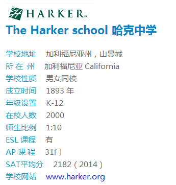 哈克中学是加州最大的K-12年级的私立走读混校,目前有2000名学生。同时,Harker中学是加州顶尖高中之一,课程难度非常大,除了开设高达31门的AP课程外,还开设几十门后AP课程(Post-Advanced Placement Courses)难度高于AP。