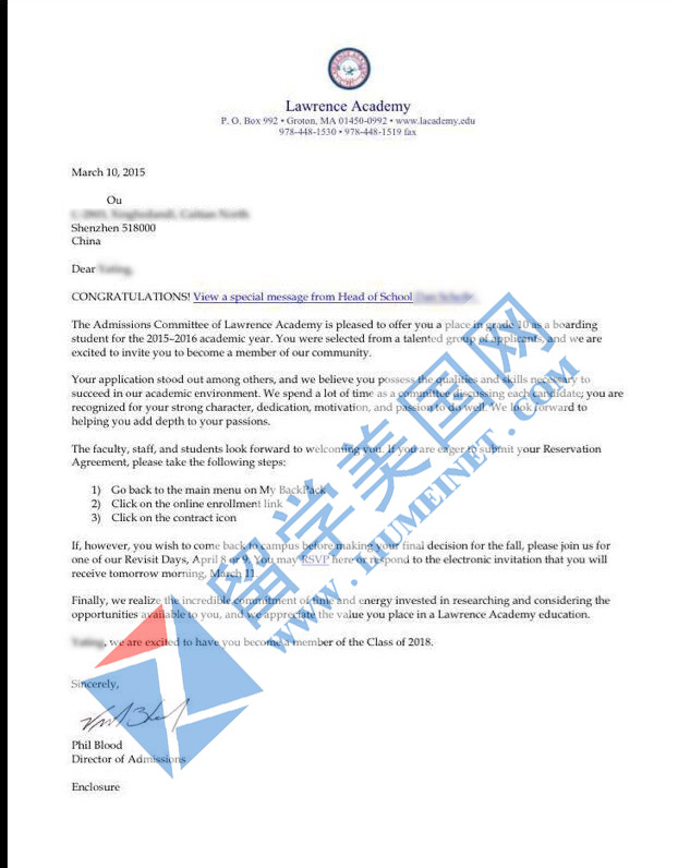 恭喜欧同学获劳伦斯中学取!