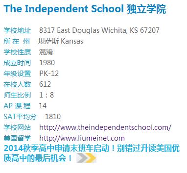 The Independent School(独立学院)建于1980年,是堪萨斯州3所蓝带学校的其中一所,也是威奇托及其周边地区最受欢迎的学校,更是堪萨斯州综合排名的第一的名校。该校是以大学升学为教学目标的无宗教性质的独立学校,采用精英小班制教学,师生比仅为1:8,学生会受到更多的关注度及接受更加具有针对性的辅导与支持。