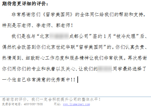 15秋季入学的孩子们陆续拿到心仪的学校录取,并顺利完成了留学申请。感谢大家对留学美国网的支持与信任,以及给与我们的高度评价,我们会做的更好!下面节选了一位家长的反馈: