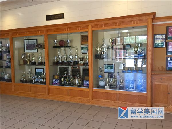 学生体育成就/获奖情况:学校在13个体育项目有50个运动队,约82%的高中学生至少参加一项体育运动。学校各个校队共荣获22次州冠军。不少毕业生进入大学运动队。下面是学校奖杯的实拍。