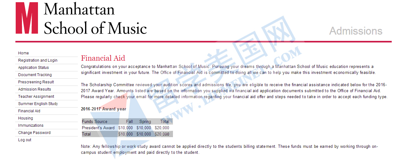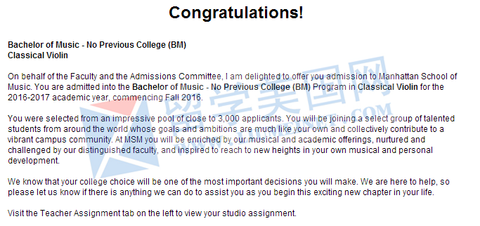 恭喜留美网张同学被美国Manhattan School of Music录取并获得奖学金