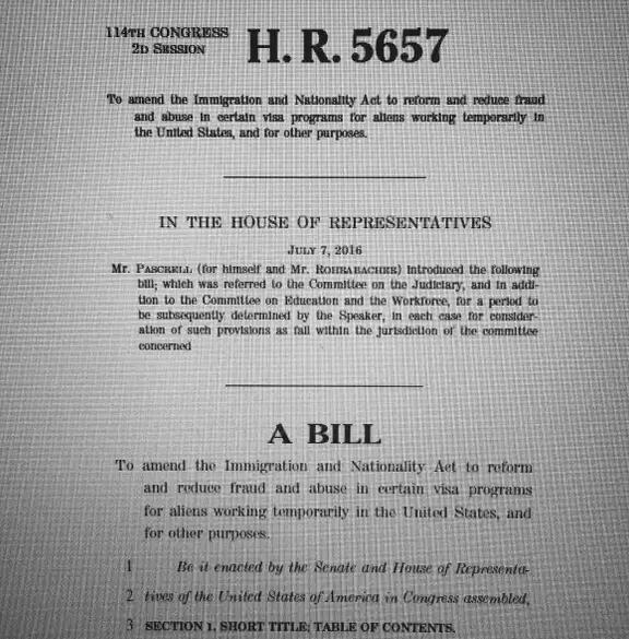 《2016年H-1B 和L-1 签证改革法案》(《H-1B and L-1 Visa Reform Act of 2016》,Sponsored by representative Bill Pascrell (Representing the 9th District of New Jersey)