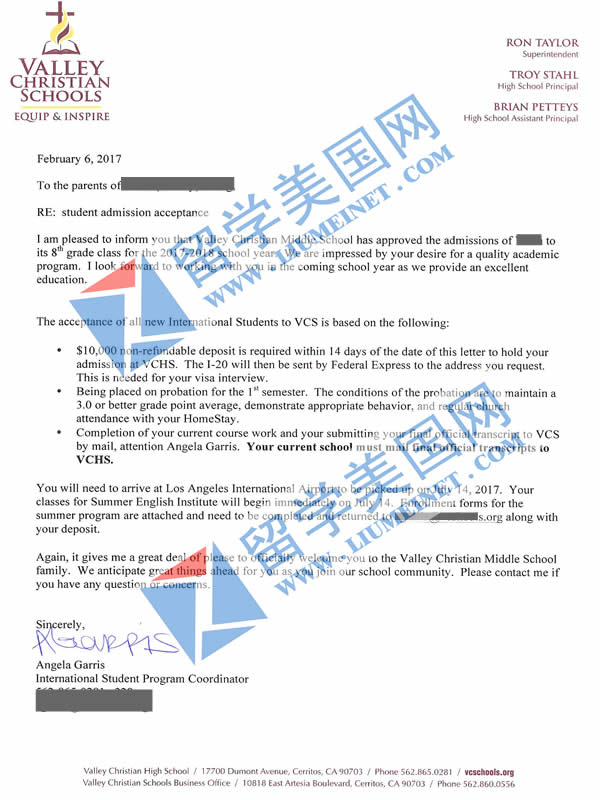 恭喜W同学获得Valley Christian Schools Cerritos录取offer