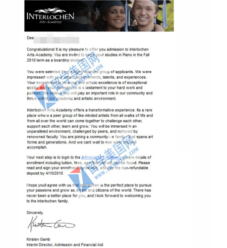 Interlochen Arts Academy因特劳肯艺术学院,创立于1928年,位于密歇根州的西北部,靠近Traverse城,学校占地1200英亩,学院是国家第一所视觉艺术和表演艺术的男女合校的寄宿高中,并且也是最有名望的一所。