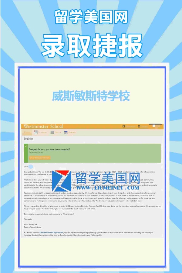 威斯敏斯特学校有着全国最好的大学预科学校之一美誉的威斯敏斯特学校位于康涅狄格州辛斯伯里,是全国一流的寄宿学校之一。该校超强的文科传统项目使9至12年级的学生们在学校学习期间可以充满挑战性和活力,同时培养他们对学习的热爱,这是一种终身的习惯。