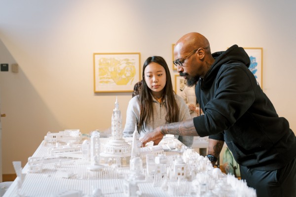 登上由里德校园中心朝北的拱形窗户照亮的螺旋楼梯——这是绘画的完美间接光线——加入一群关心艺术的同学。无论是第一次上艺术课还是有经验的艺术家,都会遇到一个支持性的、非评判性的环境,在这里学生可以随心所欲地发挥自己的热情。加纳裔加拿大艺术家埃库·尼马科带着他标志性的乐高设计作品到校园待了一周。