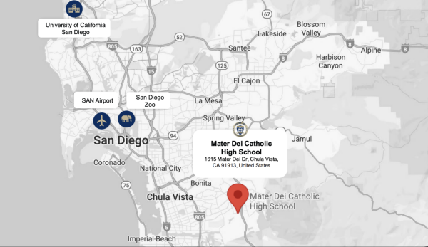 学校位于美国加利福尼亚州南部的楚拉维斯塔市(Chula Vista,California),距离圣地亚哥(San Diego)市中心约14公里(9英里)。圣地亚哥位于美国加利福尼亚州最南端,濒临太平洋,与墨西哥接壤,是美国第八大城市,也是加州气候最宜人的海滨都市之一。这里四季如春,年均气温约21℃,阳光充足、空气清新,被誉为“美国最美海港城市”。圣地亚哥以优质的教育和创新氛围闻名,聚集了加州大学圣地亚哥分校(UC San Diego)、圣地亚哥大学(USD)等知名高校,并拥有世界领先的科研机构和生物科技园区。城市安全、生活节奏舒适,文化与艺术活动丰富,著名景点包括圣地亚哥动物园、巴尔博亚公园、海洋世界及金色海滩等。作为Mater Dei Catholic High School的所在地,这里为学生提供了兼具学习、休闲与多元文化体验的理想成长环境。