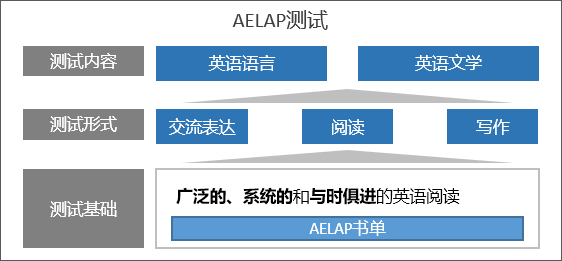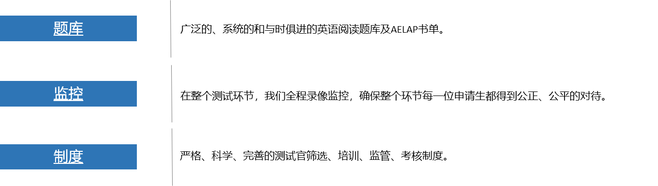 AELAP以广泛的、系统的、和与时俱进的英语阅读为基础,通过科学、系统的考核机制,对非英语母语国家的学生从阅读、写作、交流表达三个方面进行考核。从而在对其英语技巧进行评估以外,更注重对申请生的英语实际能力进行考评。