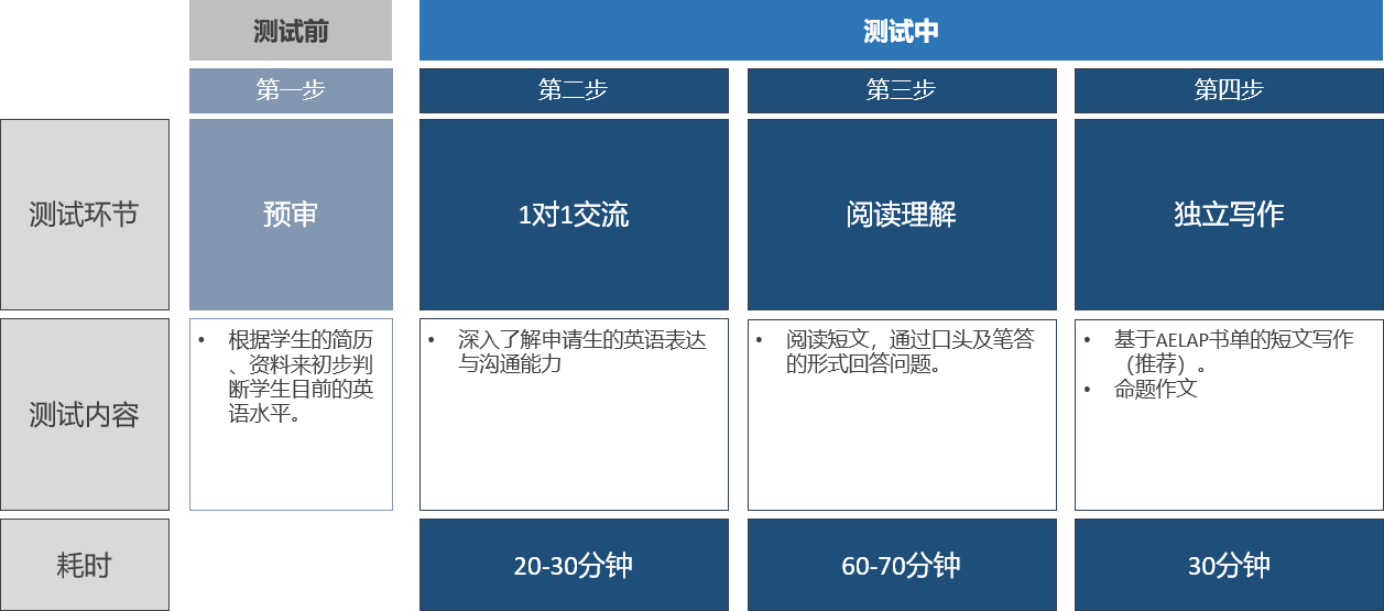 通过书库、考前预审、1对1问答式的阅读理解、写作等完整的考评流程,来确保全面了解申请生的英语掌握能力。