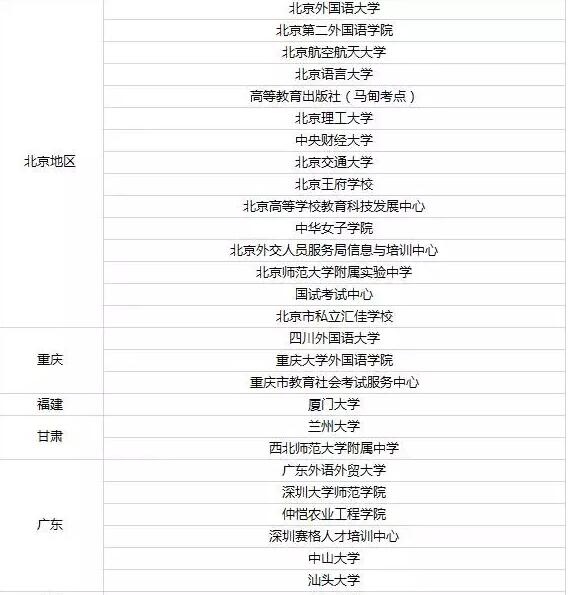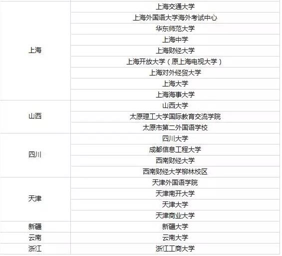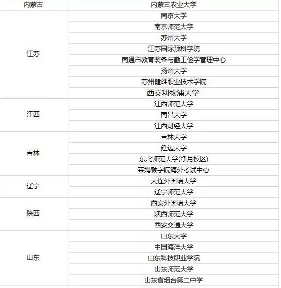 2017全国托福考试考点大全