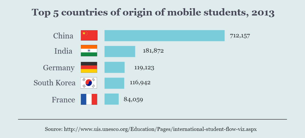 4. 留学生最多的国家是中国和印度。据联合国教科文组织统计,2013年中国留学生人数为712157人。几个小国,包括安道尔、安圭拉、百慕大、列支敦士登、卢森堡、蒙特塞拉特、塞舌尔以及特克斯和凯科斯群岛,在国外学习的学生多于在国内学习的学生。