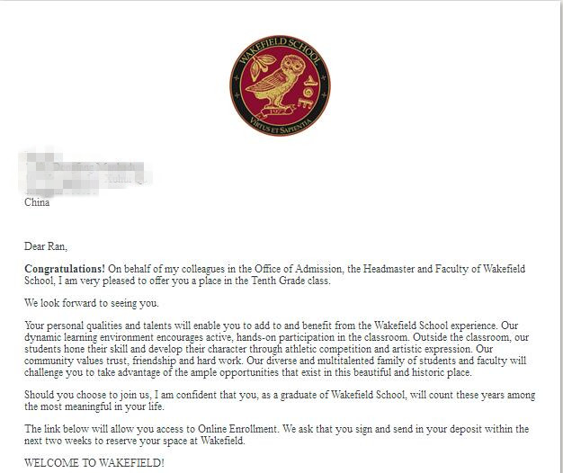 恭喜S同学成功补录到顶尖高中Wakefield School