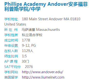 菲利普斯学院Phillips Academy位于美国东北部的马塞诸塞州,菲利普斯学院成立于1778年,也被称为安多夫,是一个独立的,男女平等的中学,具有广阔的世界观和卓越的学术遗产。这所占地191公顷的校园便是获奖的Phelps科学中心所在地,课程多样性,课外活动丰富,拥有超过300个课程,150多个选修课程,菲利普斯学院SAT:1450,学生人数:1150,教师比例:5:1,菲利普斯学院PhillipsAcademy也是波斯顿最好的私立高中。