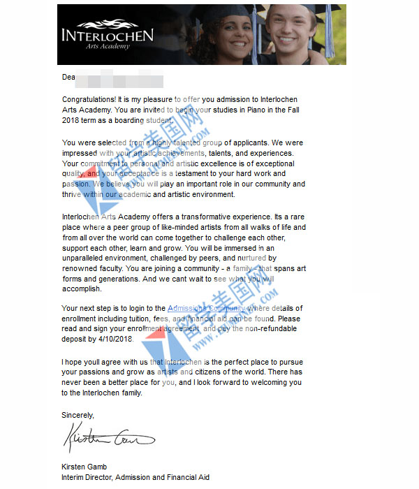 恭喜Z同学获得 Interlochen Arts Academy 录取offer!Z同学钢琴弹得非常棒!英语水平一般!留美网的老师通过给孩子做培训,面试的时候很成功,最终帮孩子拿到了录取!想申请的同学可以马上咨询:400-000-7805,010-65183908,微信:liumeinet2014