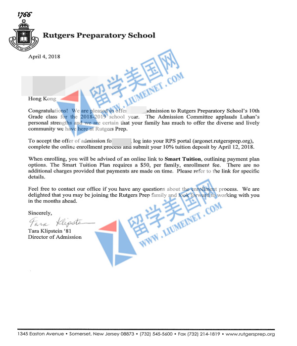 恭喜Y同学成功补录到 Rutgers Preparatory School!这是一所新泽西的顶尖牛校,Y同学的case申请时间比较晚,但是留美网的同事接到Case之后加班加点,最终帮Y同学成功补录到 Rutgers Preparatory School!美国高中补录热线:400-000-7805,微信:liumeinet2014