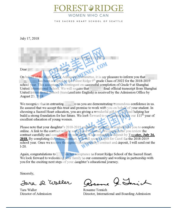 恭喜留美网同学成功补录到寄宿女校Forest Ridge School of the Scared Heart(私立女校全美排名54)